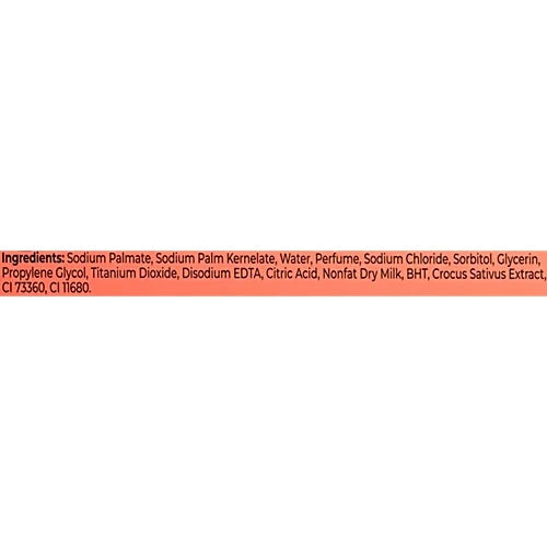 Sodium Palmate, Sodium Palm Kernelate, Water, Perfume, Triocarbon, Sodium Chloride, Glycerin, Titanium Dioxide, Disodium EDTA, BHT, Citric Acid, Whole Dry Milk, Crocus Sativus Extract, CI 73360, CI 11680